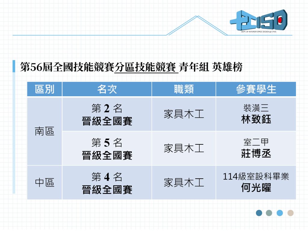 狂賀第56屆全國技能競賽分區技能競賽 青年組 英雄榜Post author:室設科Post published:2026-04-01Post category:室設科公告 / 室設科競賽榮譽榜裝潢三。林致鈺室二甲。莊博丞114畢業生。何光曜 Post Views: 23Tags: 得獎