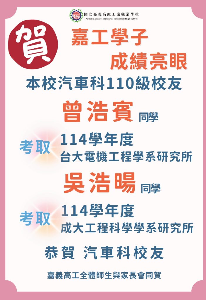 恭賀本科校友 曾浩賓同學考取114學年度台大電機工程學系研究所 及 吳浩暘同學考取114學年度成大工程科學學系研究所Post author:汽車科Post published:2025-11-18Post category:汽車科升學榜單 Post Views: 37