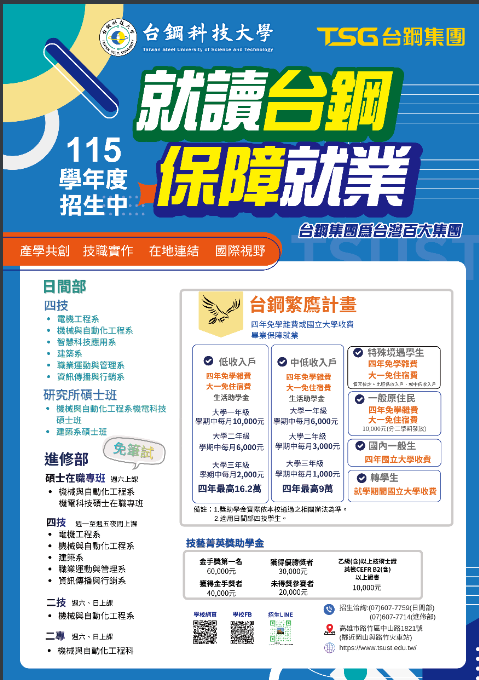 轉知115學年度台鋼科技大學招生宣導海報Post author:教務處Post published:2026-01-02Post category:教務處 / 教務處公告轉知115學年度台鋼科技大學招生宣導海報 Post Views: 31