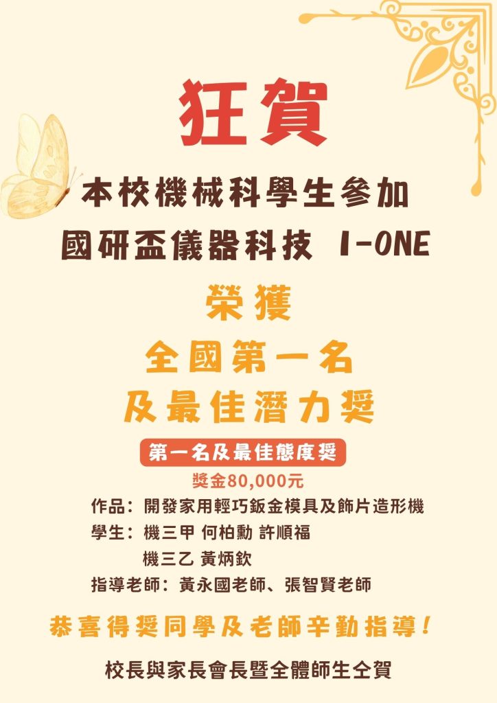 榮譽機械科114年ione 國研盃儀器科技創新獎 機械科榮獲全國第一名Post author:教務處Post published:2025-10-20Post category:榮譽榜 / 訊息公告114年ione 國研盃儀器科技創新獎 機械科榮獲全國第一名和最佳潛力獎 獎金80,000作品名稱:開發家用輕巧鈑金模具及飾片造形機獲獎學生:機三甲何柏勳、許順福、機三乙黃炳欽指導教師:黃永國老師、張智賢老師 Post Views: 98