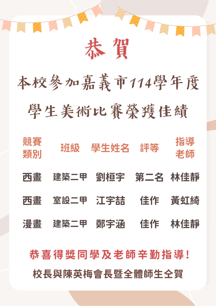 榮譽教務處嘉義市114學年度學生美術比賽榮獲佳績Post author:教務處Post published:2025-10-27Post category:榮譽榜 / 訊息公告 Post Views: 81