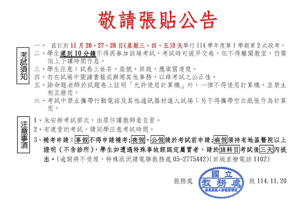 重要教務處114-1第2次段考-考試科目、時間分配及重要事項宣達(公告)Post author:教務處Post published:2025-11-20Post category:校務行政 / 訊息公告114-1第2次段考科目時間表給學生專用1141125公告-3下載 Post Views: 1,085
