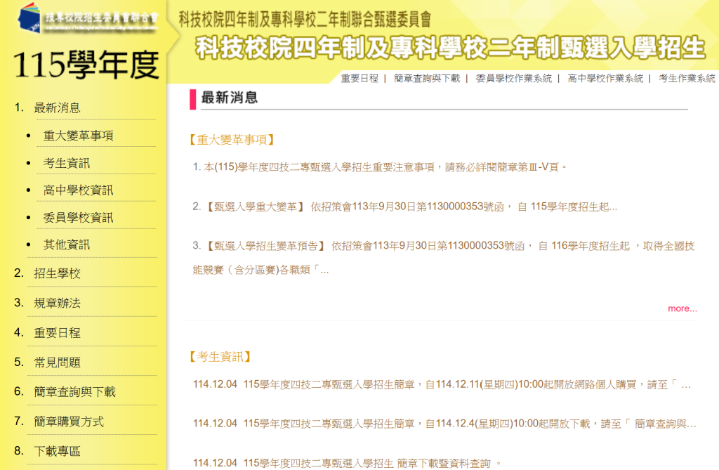一、旨揭招生各階段重要日期及其他詳細規定,務必詳閱招生簡章,招生簡章訂於114年12月4日起於本招生官網(https://www.jctv.ntut.edu.tw/enter42/apply/)公告並提供下載,簡章查詢系統於同日10:00起開放查詢使用。