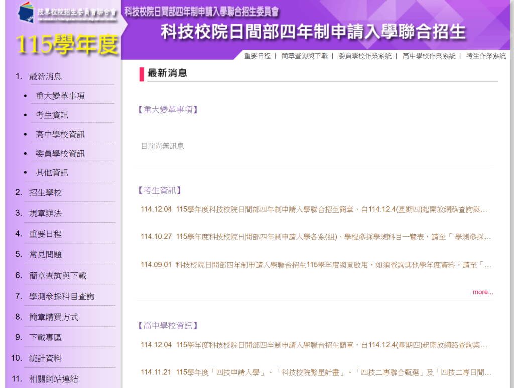 一、旨揭招生簡章訂於114年12月4日起於本委員會網站(https://www.jctv.ntut.edu.tw/caac/)公告,並提供下載,簡章查詢系統於同日10:00起開放查詢使用;紙本招生簡章自本年12月11日起公開發售。