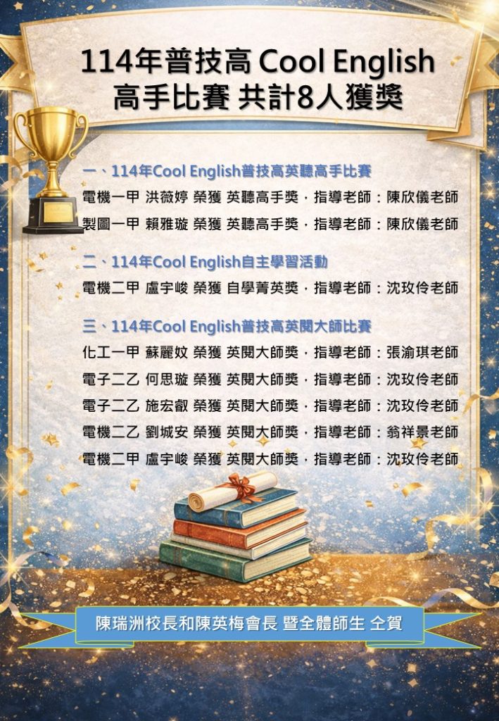 榮譽教務處114年普技高Cool English高手比賽 共計8人獲獎Post author:教務處Post published:2025-12-28Post category:榮譽榜 / 訊息公告 Post Views: 90