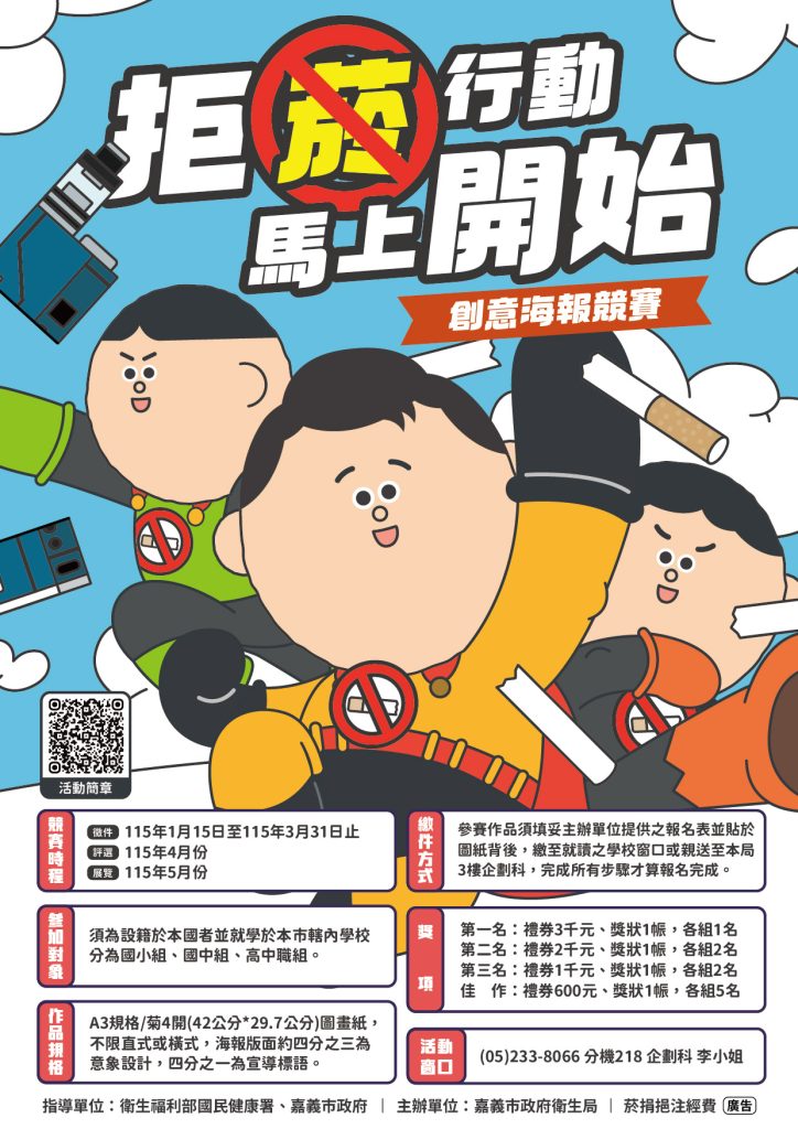 競賽衛生組轉知衛生局辦理「拒菸行動,馬上開始!」菸害防制創意海報競賽一案。Post author:學務處衛生組Post published:2026-01-09Post category:學務處 / 學務處訊息公告 / 活動比賽及多元學習 / 訊息公告檢附活動簡章及報名表(如附件)「拒菸行動,馬上開始」菸害防制創意海報競賽下載 Post Views: 45