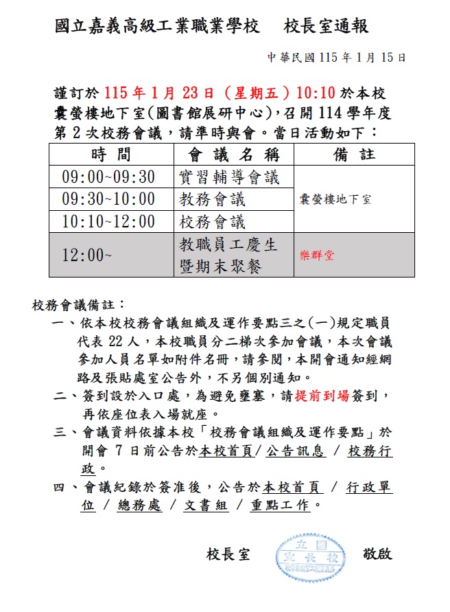 公告文書組謹訂於1月23日(五)於10:10囊螢樓地下室召開114學年度第2次校務會議(含1/23活動日程)Post author:文書組Post published:2026-01-16Post category:公布欄 / 校務行政 / 總務處 / 總務處公告 / 置頂 / 訊息公告114-2校務會議議程-1150123-3下載114-2校務會議程序表-1150123-3下載114-2校務會議通報函-115-01-15.doc-1下載114-2座位表下載 Post Views: 245