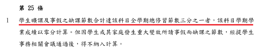 一、依據高級中等學校「學生學習評量辦法」第25條,學務處預計於115年1月19日(星期一),提供學生曠課及事假之缺課節數合計達該科目全學期總修習節數三分之一名單,會在校務系統上發放預警通知,再請老師至預警系統確認,並依規定輸入零分計算。