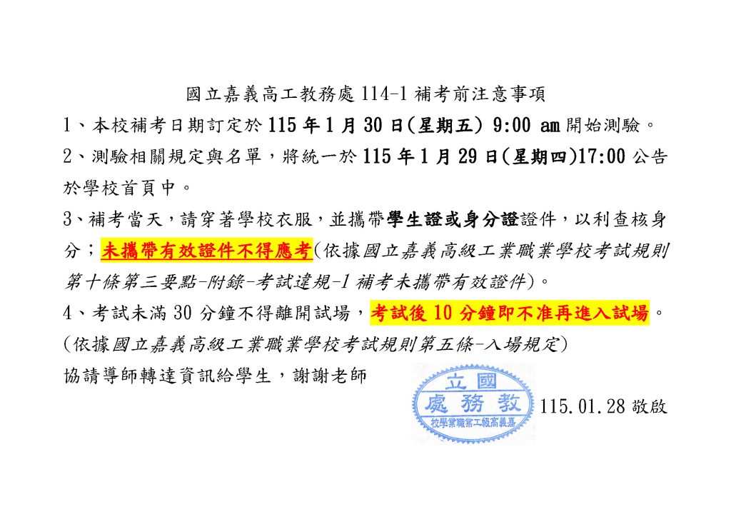 公告教務處114學年第一學期補考事前注意事項Post author:教務處Post published:2026-01-28Post category:教務處 / 教務處公告 / 校務行政 / 訊息公告補考前注意事項溫馨提醒,再請有參加本次補考同學留意,祝福各位同學,補考應試順利!考試規則,請參閱如下:嘉義高工考試規則-1141216訂定下載 Post Views: 1,223