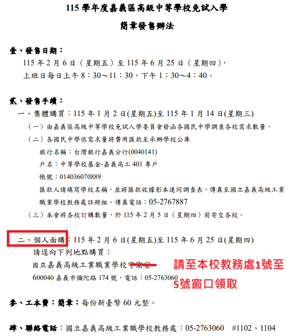 公告嘉義區免試入學115學年度嘉義區高級中等學校免試入學簡章開始販售日期:115年2月6日(星期五)~115年6月25日(星期四),請欲購買民眾至本校教務處購買Post author:教務處Post published:2026-02-05Post category:115免試入學全部訊息 / 置頂 / 訊息公告請於上班日至本校教務處1號至5號窗口購買。提醒:2/14至2/22春節年假,無販售。 Post Views: 16