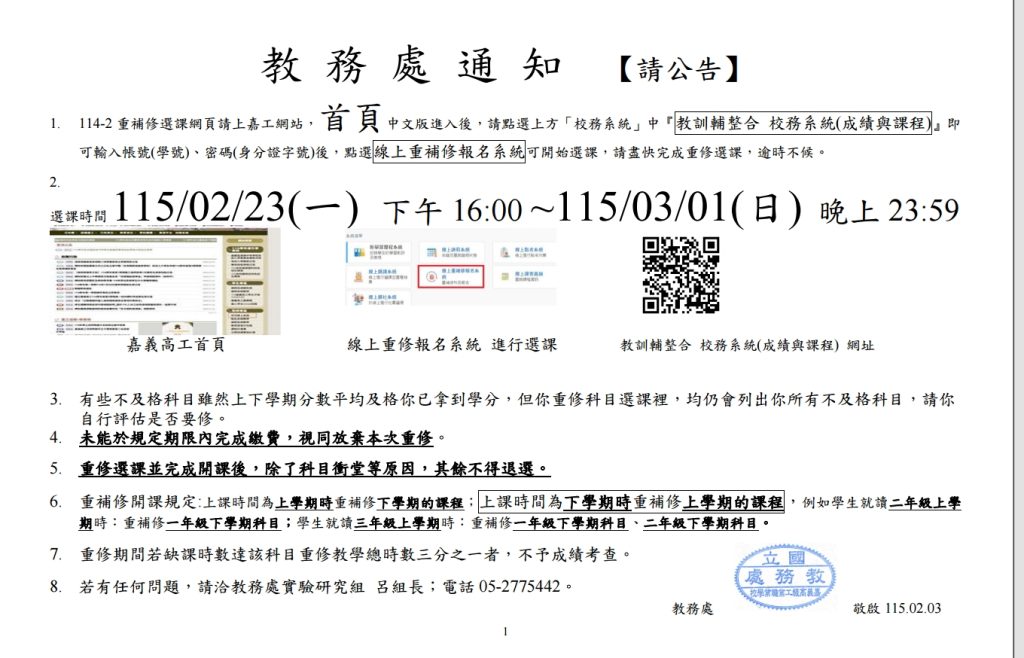 公告實驗研究組114-2重補修公告(選課時間)Post author:cyivscy081Post published:2026-02-11Post category:實驗研究組重點工作 / 教務處 / 教務處公告 / 校務行政 / 校務行政 / 訊息公告 Post Views: 168