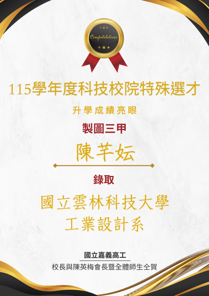 榜單教務處115年科技校院特殊選才本校榜單Post author:教務處Post published:2026-02-25Post category:教務處 / 教務處公告 / 校務行政 / 榮譽榜 / 訊息公告賀本校製圖三甲陳芊妘同學錄取國立雲林科技大學工業設計系 Post Views: 30