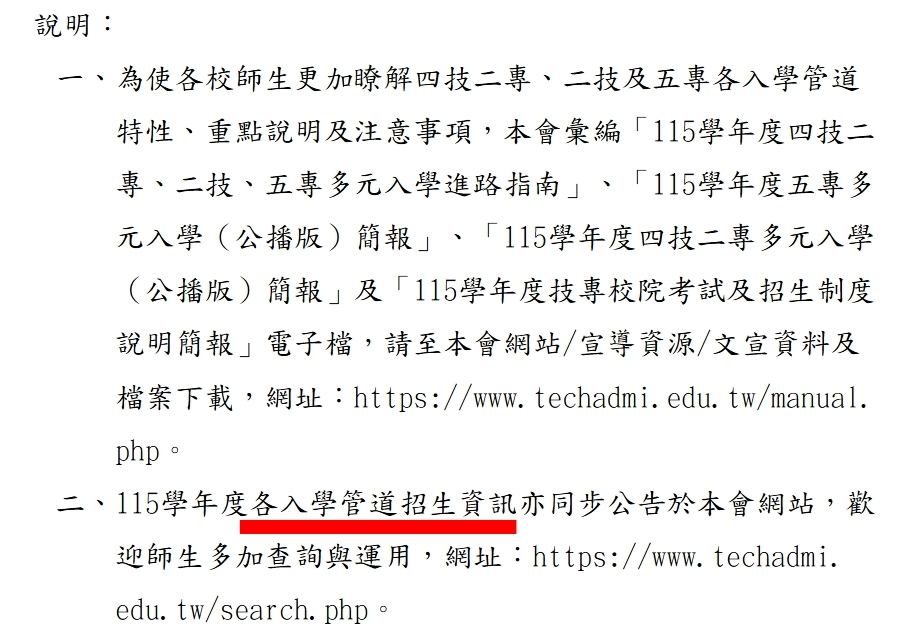 公告教務處轉知115技專校院招生策略委員會各入學管道招生資訊Post author:教務處Post published:2026-03-10Post category:校務行政 / 校務行政 / 訊息公告https://www.techadmi.edu.tw/search.php Post Views: 58