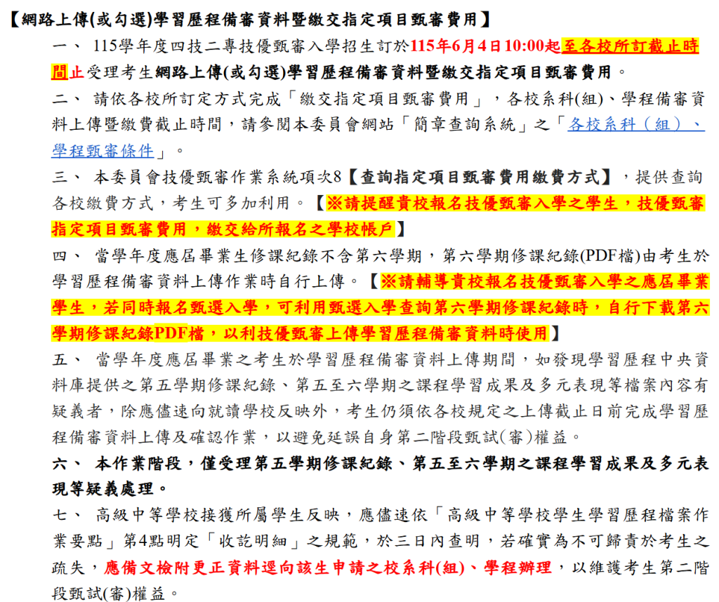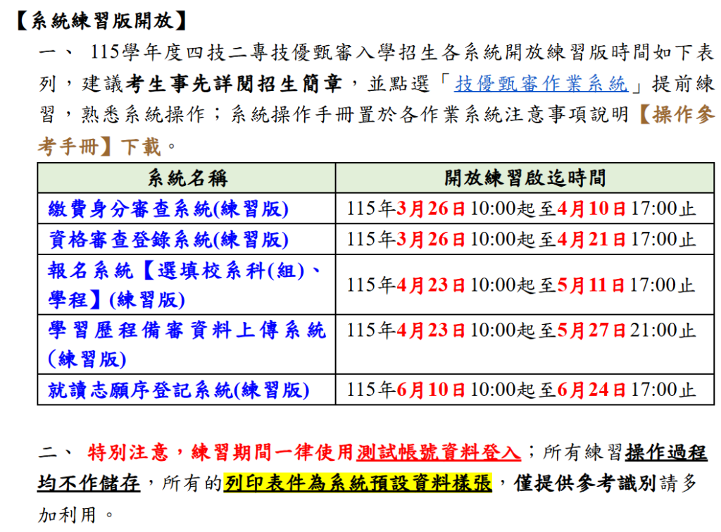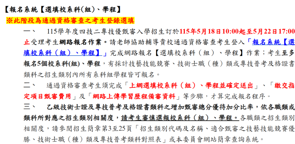 【115技優甄審】有關115學年度四技二專技優甄審入學招生「報名相關資訊」(考生個別報名,敬請自行留意時程)