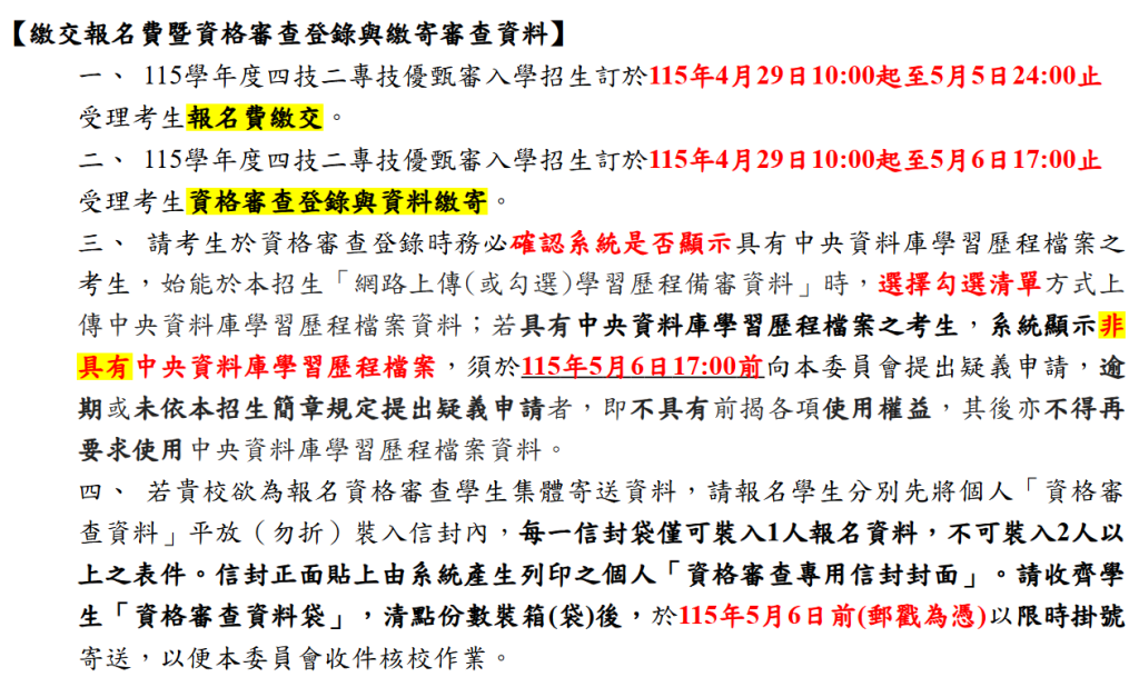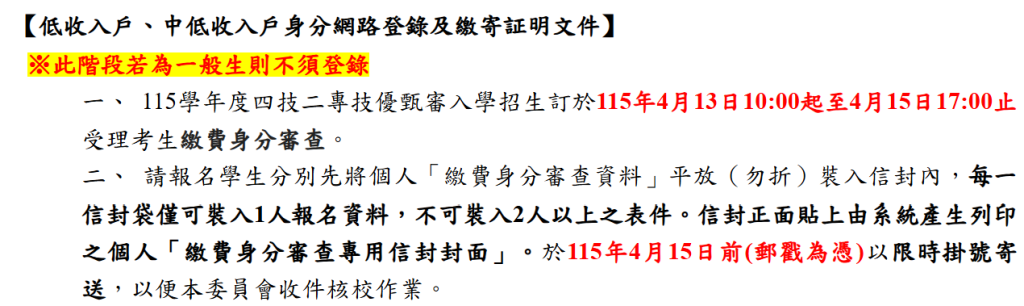 相關資訊,可至115學年度四技二專技優甄審入學招生考生作業系統留意時程。