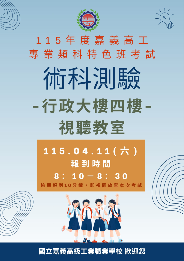 特招註冊組【嘉工115特招】參加特色招生准考證已於115年4月1日限時掛號寄出,請考生留意參加4月11日當天術科測驗注意事項。 – 國立嘉義高級工業職業學校