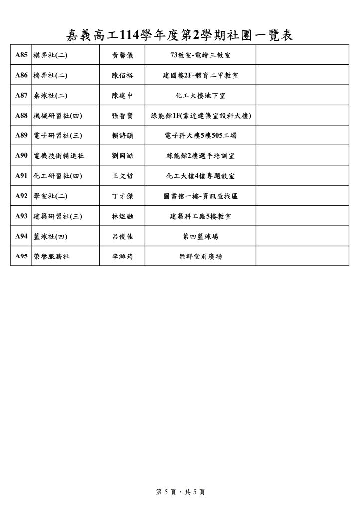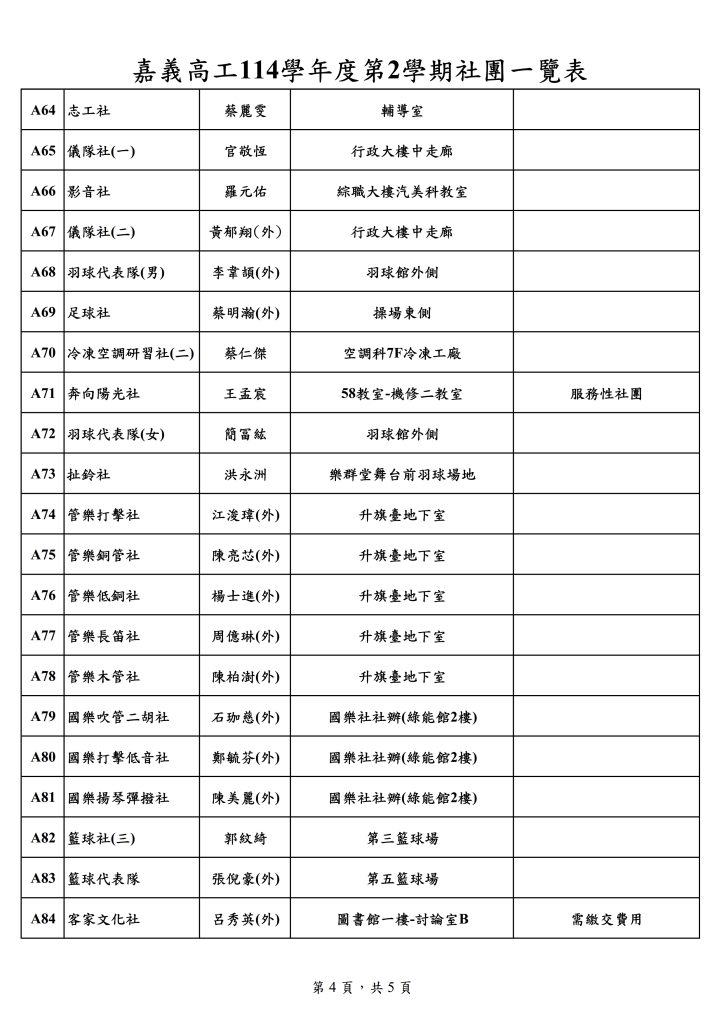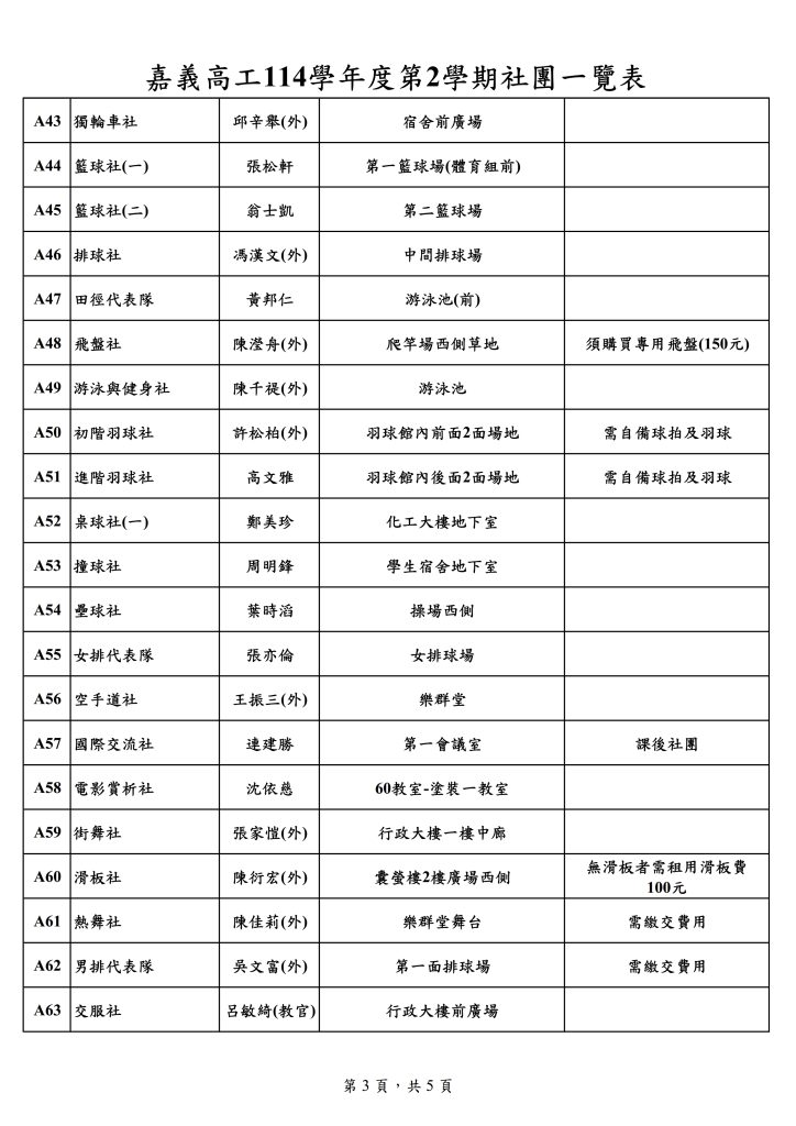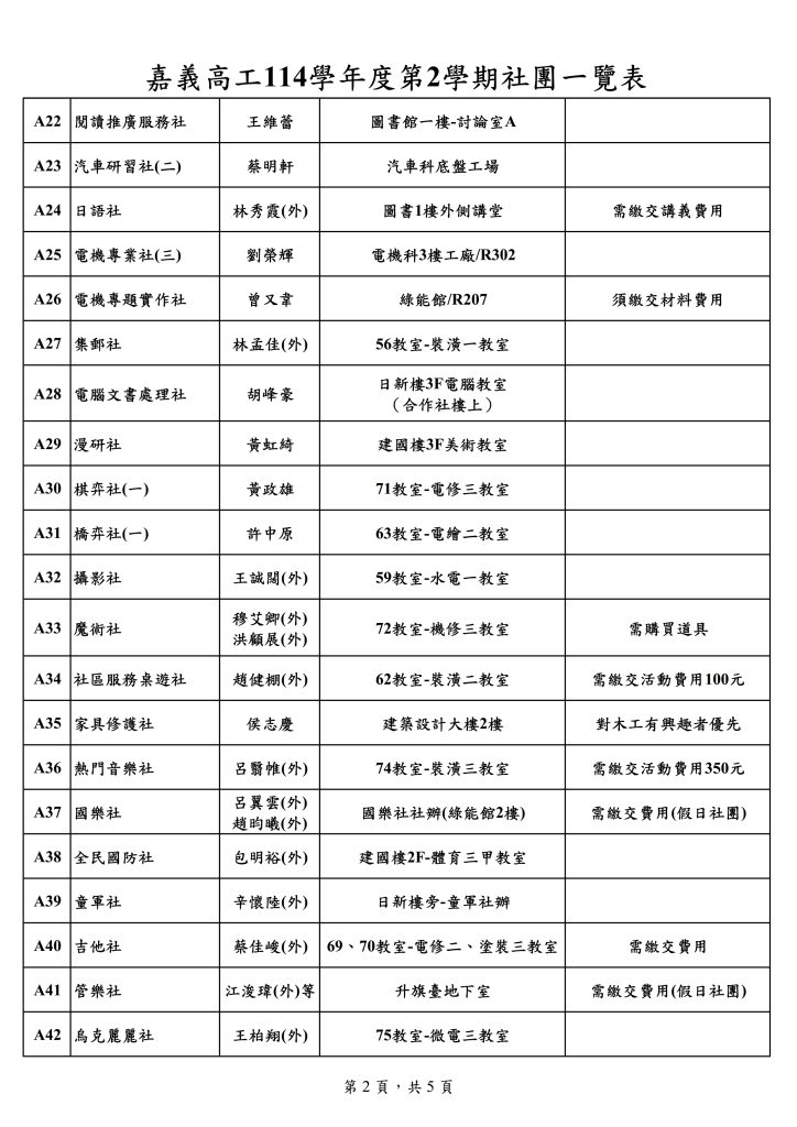 公告課外組嘉義高工114學年度第2學期社團一覽表Post author:學務處課外活動組Post published:2026-02-24Post category:校務行政 / 置頂 / 課外活動組重點工作 Post Views: 223