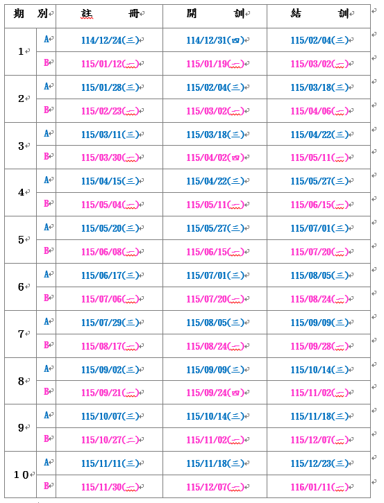 | 期別 | 註冊 | 開訓 | 結訓 |