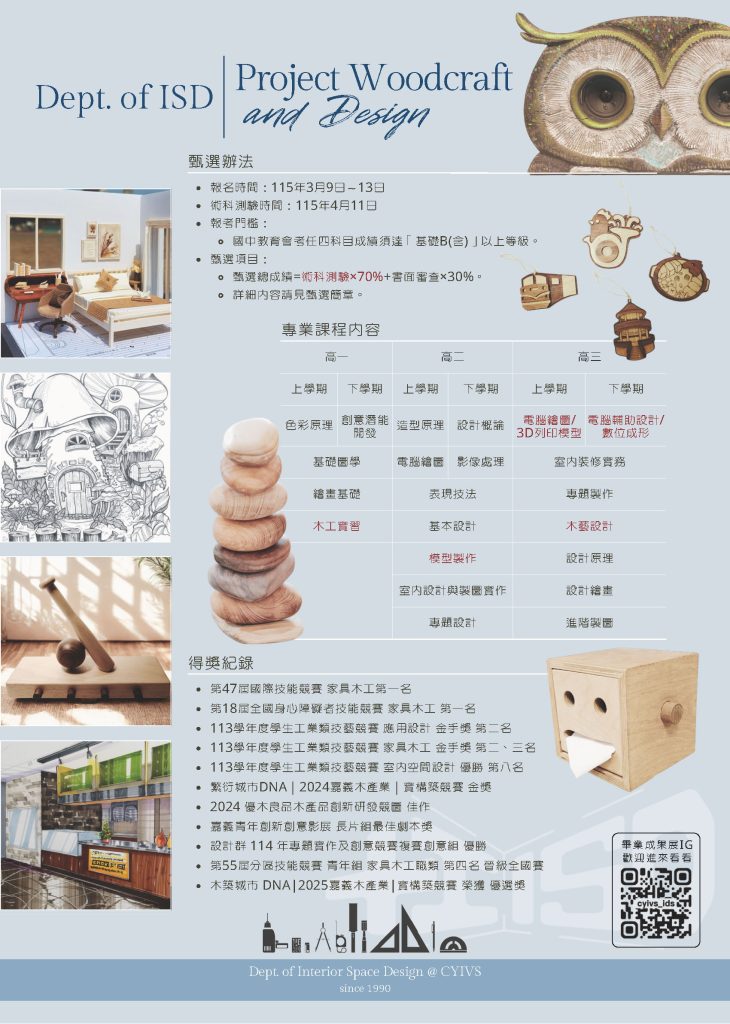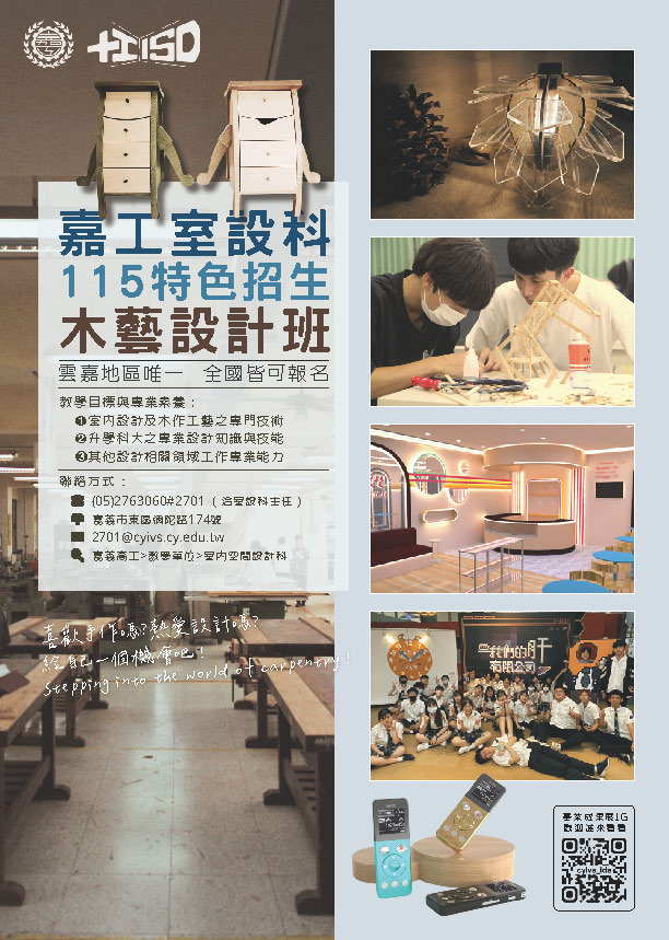 訊息公告發展計畫本科簡介課程目標師資陣容競賽榮譽榜升學榜單成果展IG特色招生-木藝設計班🅝🅔🅦 最新消息公告室設科115學年度高級中等學校特色招生專業群科甄選入學簡章公告 115室設科招生簡報&特色招生專業群科甄選試題範例