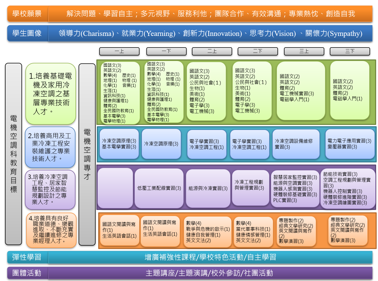 專業知識 | 1.培育一年級學生具有基礎專業知識。 2.培育二年級學生具有家用及小型冷凍空調設備修護之專業知識。 3.培育三年級學生具有商用及中型冷凍空調設備修護之專業知識。培育學生能源教育之相關知識。 | 1.配合課程有基本電學、冷凍空調原理。 2.電工機械、冷凍空調工程、電子學。 3.配合課程有電磁學。 4.配合課程有生活科技、校外參觀。 |