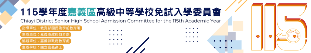 最新消息公告2025-01-15115免試入學相關簡章公告2025-12-22免試入學報名作業網路平台系統操作說明公告2025-12-22115學年度嘉義區高級中等學校免試入學報名作業資訊系統已上線公告2025-10-13115學年適性入學重要日程表已供下載more重要日程 115學年度適性入學重要日程表 (直接點選線上瀏覽,或按右鍵下載)下載專區115學年度嘉義區免試入學簡章(點擊轉跳)115學年度嘉義區高級中等學校特色招生核定作業要點(嘉義市教育局公告)下載相關網站115嘉義區高級中等學校免試入學作業入口網115學年度嘉義區高級中等學校免試入學報名作業資訊系統平臺